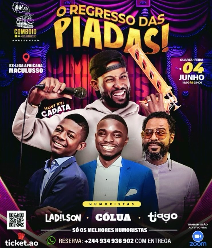 - Vou organizar um evento no dia 2025-06-04 com o tema O Regresso Das Piadas no/a Ex-Liga Africana clica no link para saber mais.