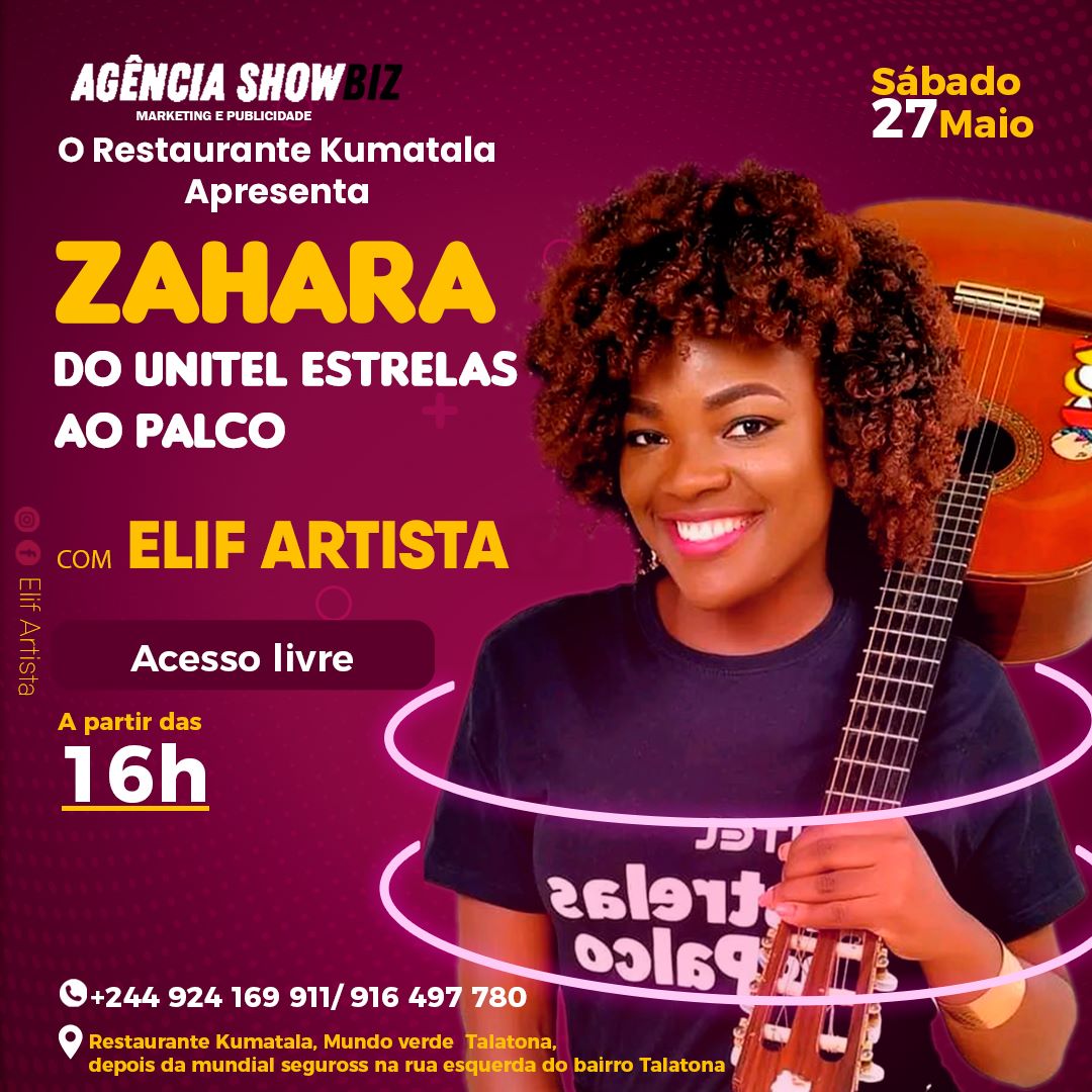 - Vou organizar um evento no dia 2023-05-27 com o tema Zahara Com Elif Artista no/a Restaurante Kumatala, Mundo Verde, Talatona clica no link para saber mais.