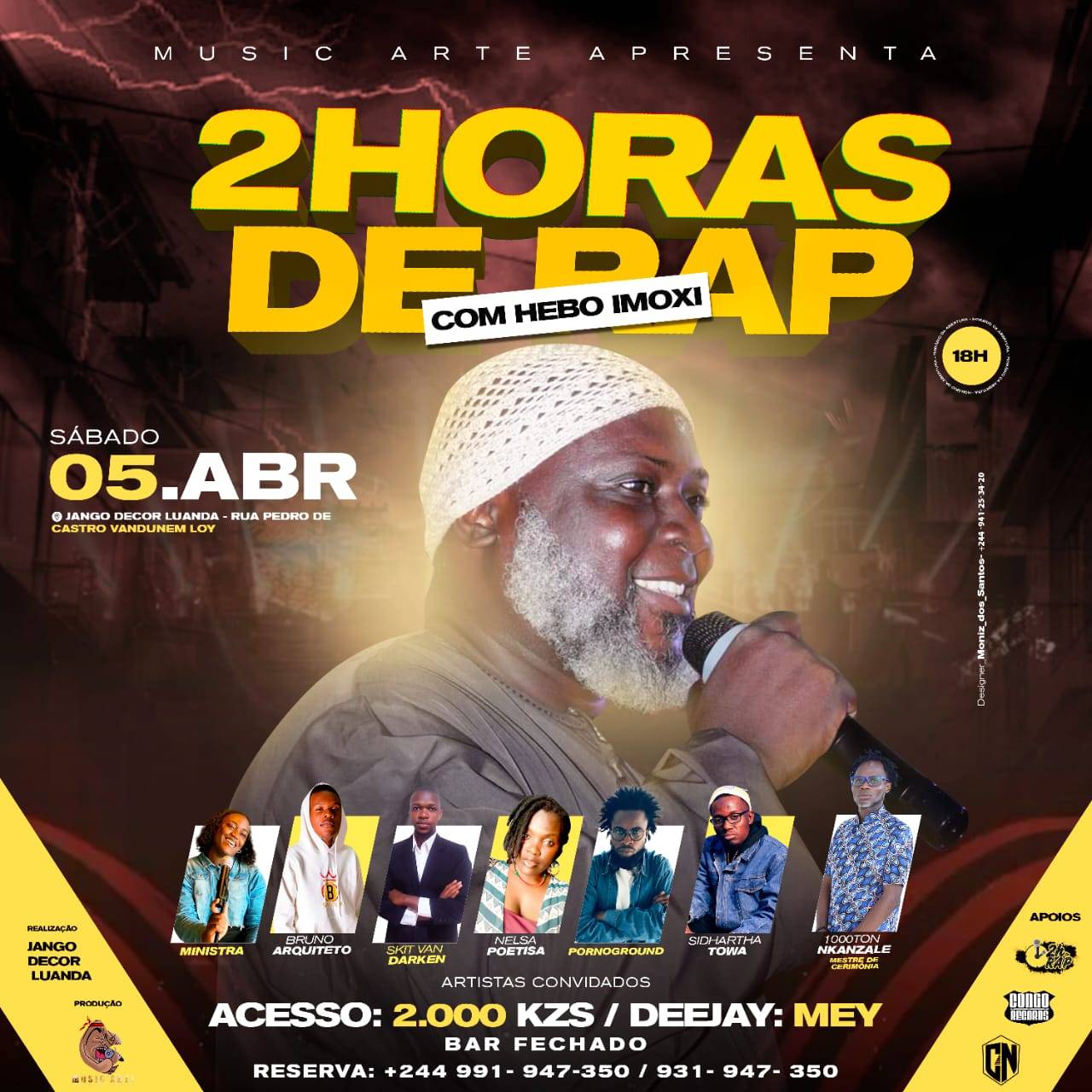 - Vou organizar um evento no dia 2025-04-05 com o tema 2 Horas de Rap no/a Jango Decor, Luanda clica no link para saber mais.