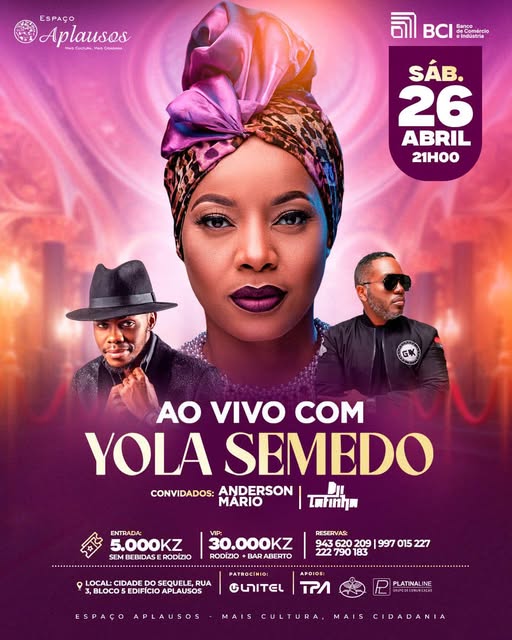 - Vou organizar um evento no dia 2025-04-26 com o tema Ao Vivo Com Yola Semedo no/a Espaço Aplausos, Rua 3, Bloco 5, Sequele clica no link para saber mais.