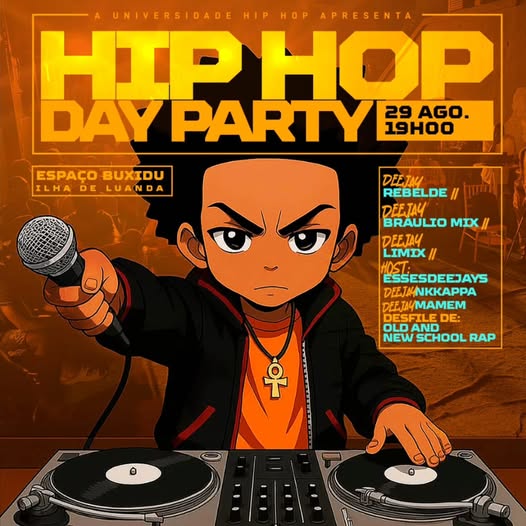 - Vou organizar um evento no dia 2025-08-29 com o tema Hip Hop Day Party 2025 no/a Espaço Buxido, Ilha de Luanda clica no link para saber mais.