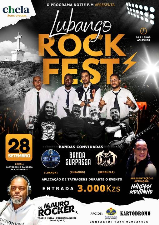 - Vou organizar um evento no dia 2024-09-28 com o tema Lubango Rock Fest no/a Chela, Lubango clica no link para saber mais.